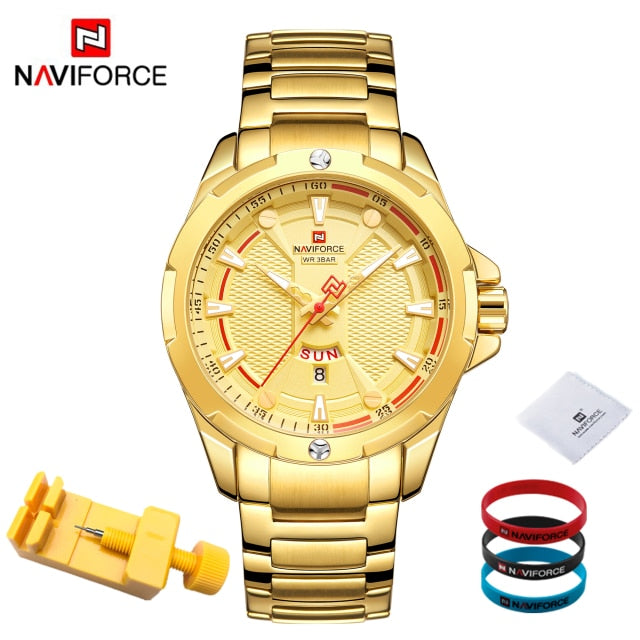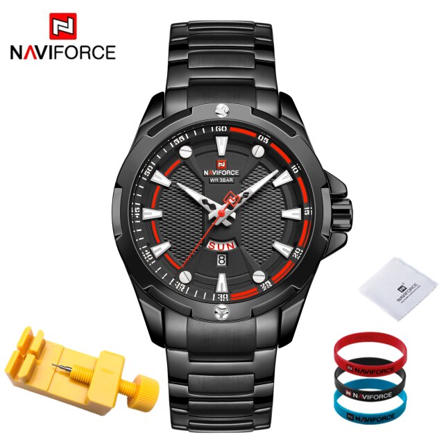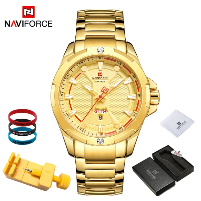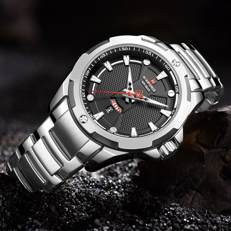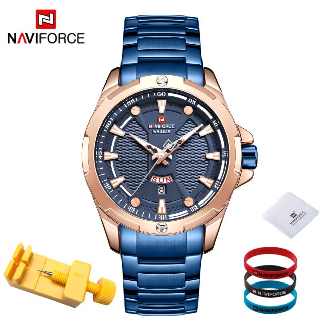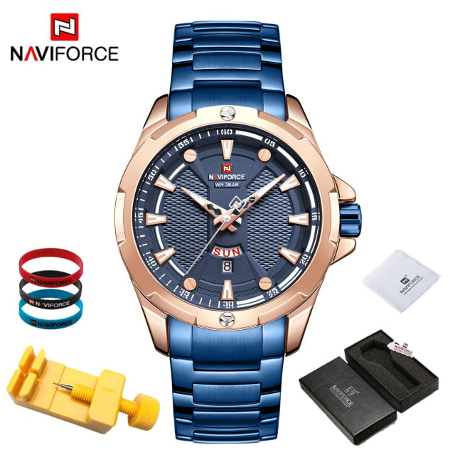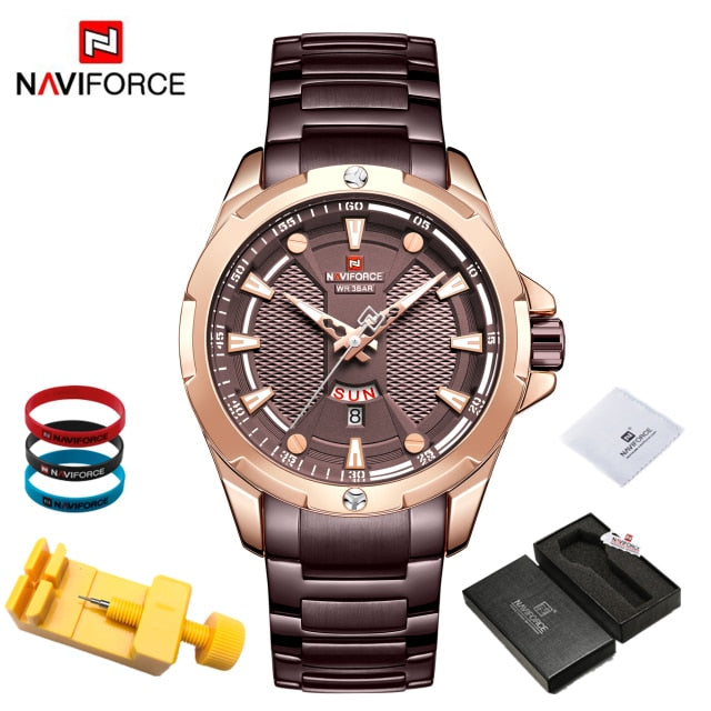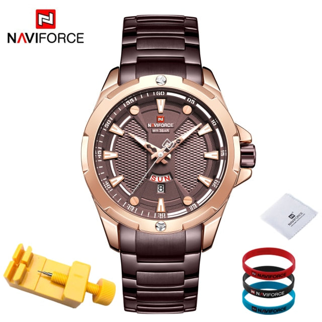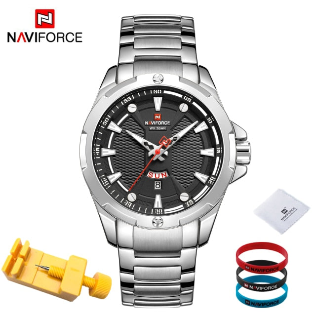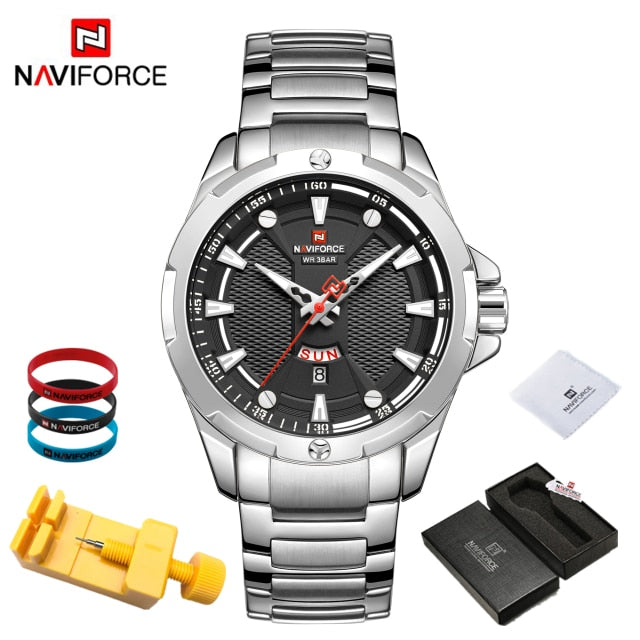 Introducing the epitome of sophistication and functionality: the NAVIFORCE Men's Analog Watch. Elevate your style and punctuality simultaneously with this top-tier luxury timepiece that seamlessly blends timeless elegance with cutting-edge technology. Crafted with precision, the stainless steel construction ensures durability while exuding a polished and refined aesthetic. Stay on schedule with the integrated date feature, adding a practical touch to your everyday timekeeping. With its reliable quartz movement, this relogio masculino guarantees accurate timekeeping, ensuring you're always on time, no matter the occasion. Upgrade your wrist game with the NAVIFORCE Men's Analog Watch – where luxury meets utility in a perfect blend. Make a bold statement and seize every moment with a timepiece that not only complements your style but enhances your entire look. Time is of the essence; make it count with NAVIFORCE.