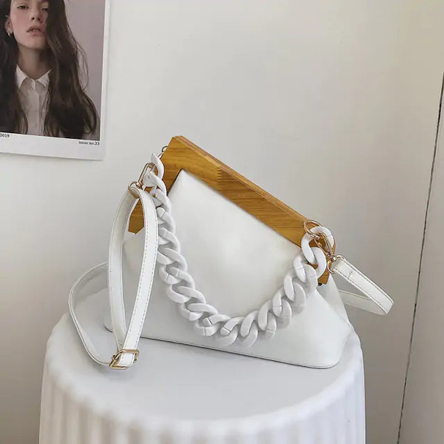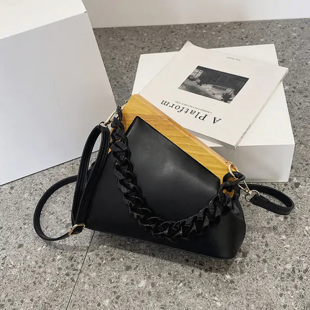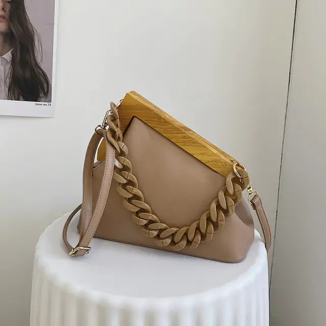 Do you like sophisticated handbags with a touch of luxury? If so, you'll love our Wooden Handle Handbag! This beautiful handbag is made with high-quality PU leather and features a thick chain strap and triangle design. The wooden handle adds an elegant touch, making it perfect for special occasions. Whether you're carrying it as a purse or using it as a clutch, this bag is sure to turn heads. So don't wait any longer, order your Wooden Handle Handbag today!